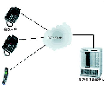 目前,根據(jù)建設(shè)思路中所提到的分期實(shí)施原則,第一期只完成本地多方電話會(huì)議中心平臺的建設(shè)。參加電話會(huì)議的各方用戶均直接通過公眾電話網(wǎng)撥入中心平臺,由中心平臺統(tǒng)一接入并組織會(huì)議資源為用戶服務(wù),結(jié)構(gòu)如圖2所示。