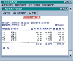 - 每種電話明細(xì)報(bào)表皆有提供通話日期、時(shí)間、外線號碼、外撥電話號碼、外撥電話類別、通話通數(shù)、通話時(shí)間、通話金額、外撥區(qū)域之資料,而且還提供資料匯總。