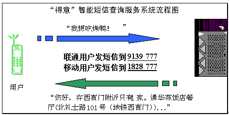 2004年4月15日和4月20日,擁有完全自主知識產(chǎn)權的語音與語言技術開發(fā)商和技術提供商北京得意音通技術有限責任公司(得意公司),在國際上率先把中文自然語言理解技術應用在中國聯(lián)通和中國移動短信服務平臺上,結(jié)合《精品購物指南》報社權威、全面的信息資源,開通了北京地區(qū)餐飲領域智能短信查詢服務(簡稱智能短信),并將進一步支持互聯(lián)網(wǎng)平臺和WAP平臺,陸續(xù)開通更豐富和更實用的智能信息服務。