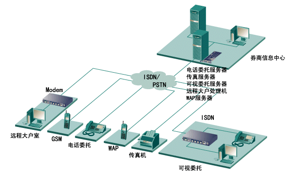 券商證券委托一般包括:電話傳真委托、可視委托(又稱遠(yuǎn)程大戶室)和網(wǎng)上委托等。其中除網(wǎng)上委托可通過Internet網(wǎng)外,其它委托必須通過PSTN網(wǎng)來連接。在當(dāng)前階段,此類委托占有最大的客戶群。以前,每個券商為了實現(xiàn)此類委 托,必須在券商中心的機(jī)器上安裝語音卡、傳真卡、座席卡來滿足電話傳真委托,另外還必須在另外一臺機(jī)器上安裝多串口卡和Modem Pool與座席卡相連來滿足可視委托,遠(yuǎn)程大戶室等業(yè)務(wù)。此方案,用戶不僅需要購買很多卡,占用很多機(jī)器插槽,而且在實現(xiàn)可視委托時,只能接受客戶端PSTN模擬Modem的呼叫,而不能接收目前ISDN的連接方式,速度非常緩慢。本文主要提出了一種采用Eicon Diva Server PRI卡的新型解決方案,本方案不僅省去了在中心插上傳真卡、語音卡、座席卡多種卡,又省去了多串口卡和Modem Pool構(gòu)件,只需在中心的一臺機(jī)器插上1-4塊Diva Server PRI卡后,便能滿足你電話傳真委托、可視委托 、遠(yuǎn)程大戶室等多種業(yè)務(wù),還支持WAP呼叫,SMS短消息發(fā)送等,在可視委托和遠(yuǎn)程大戶室業(yè)務(wù)中,不僅支持PSTN Modem的模擬呼叫,也支持ISDN的數(shù)字呼叫,方案的性價比極高,方案連接圖如下圖所示: