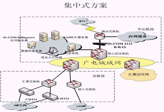 根據(jù)廣電城域網(wǎng)目前網(wǎng)絡(luò)的規(guī)模,以及以后的擴(kuò)展,采用集中接入認(rèn)證與計(jì)費(fèi),統(tǒng)一管理的方案,集中接入指:接入服務(wù)器部署在各個(gè)匯聚層的匯聚點(diǎn),即在網(wǎng)絡(luò)出口安裝寬帶接入服務(wù)器,由寬帶接入服務(wù)器對(duì)所有用戶進(jìn)行身份認(rèn)證、接入控制、實(shí)時(shí)計(jì)費(fèi)、數(shù)據(jù)采集,并將賬單和訪問(wèn)日志等傳送至綜合業(yè)務(wù)系統(tǒng)。統(tǒng)一管理指在中心機(jī)房就可以進(jìn)行全部的管理,包括:網(wǎng)絡(luò)設(shè)備管理;用戶管理;經(jīng)營(yíng)策略管理;賬務(wù)管理;安全管理;數(shù)據(jù)分析。提供完整的用戶資料分析,使用習(xí)慣分析,運(yùn)營(yíng)統(tǒng)計(jì)等詳細(xì)分析報(bào)表。