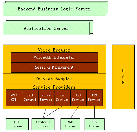 用于存放和產(chǎn)生VoiceXML腳本,可以是文件系統(tǒng)或WEB服務(wù)器,一般文件系統(tǒng)應(yīng)用于靜態(tài)腳本,WEB服務(wù)器應(yīng)用于動態(tài)腳本;應(yīng)用邏輯組件或中間件,進行事務(wù)處理。