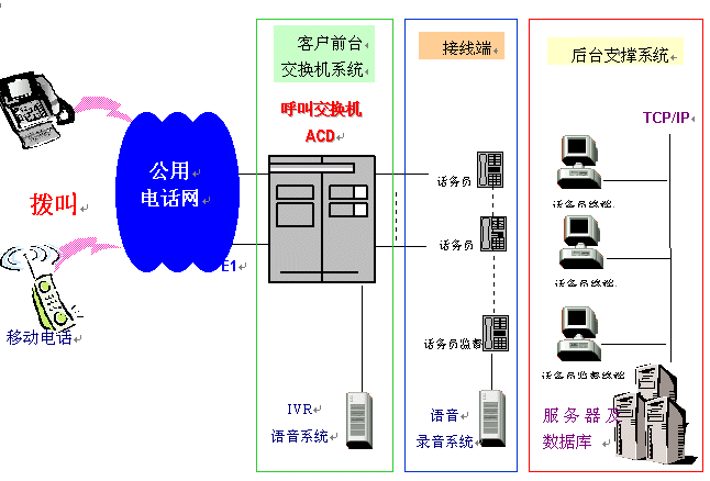 一個(gè)完整的呼叫中心解決方案通常由以下核心部分組成:自動呼叫分配(ACD)、交互式語音應(yīng)答(IVR)、計(jì)算機(jī)電話綜合應(yīng)用(CTI)、錄音服務(wù)器、呼叫管理(CMS)等。