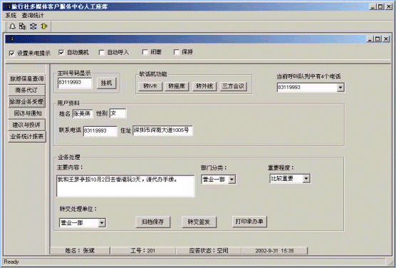 旅行社客戶服務(wù)中心系統(tǒng)將接入功能、導(dǎo)航功能、自動語音查詢功能、人工座席服務(wù)功能、話路轉(zhuǎn)接功能、信息資料處理緊密聯(lián)系起來。用戶撥打特服電話號碼后,可以根據(jù)需要選擇人工服務(wù)、自動語音查詢、自動留言,并能夠在幾種服務(wù)中來回切換或轉(zhuǎn)接其它電話;所記錄的資料可以分門別類的進行統(tǒng)計并形成報表,供相關(guān)部門進行檢索查閱;意見處理完畢,可由座席主動呼叫用戶,告知處理意見,形成閉環(huán)處理流程;從而打造全新的客戶服務(wù)形象。