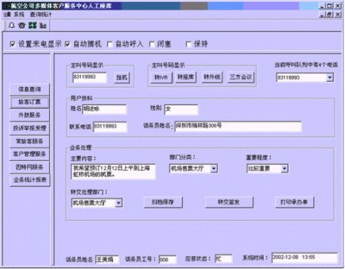 。。客戶打入電話后,當系統(tǒng)的自動語音應答子系統(tǒng)無法解決客戶問題時,客戶可選擇人工服務,由航空公司客戶服務代表直接接聽客戶電話,處理并解決客戶問題。此時客戶同座席話務人員直接溝通,并同時記錄下該客戶的聯(lián)系方式,將相關(guān)數(shù)據(jù)添加入系統(tǒng)數(shù)據(jù)庫;也可以在數(shù)據(jù)庫的支持下回答機場航班/航空貨運信息及相關(guān)規(guī)定等的咨詢和疑問、訂座/訂艙?蛻粢部梢赃x擇自動語音服務方式,根據(jù)系統(tǒng)的語音提示輸入按鍵,選擇類別,將自己的投訴和建議以及自己的聯(lián)系方式信息以留言錄音的方式保存在系統(tǒng)中。系統(tǒng)同時還支持自動傳真方式,客戶可以通過傳真機進入本系統(tǒng),通過按鍵選擇傳真方式,將自己的意見建議等的文本內(nèi)容傳真給系統(tǒng),系統(tǒng)自動接受并存入數(shù)據(jù)庫。