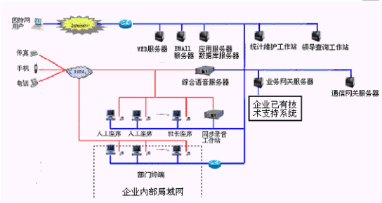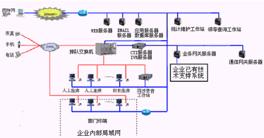 本系統(tǒng)物理結構由帶語音板卡的工控機或排隊交換機、CTI服務器、IVR(交互式語音應答)/IFR(交互式傳真應答)服務器、業(yè)務代表座席(邏輯上分為:普通業(yè)務代表座席、專家座席等)、班長座席、統(tǒng)計維護管理工作站、因特網(WEB)服務器、電子郵件(EMAIL)服務器、數(shù)據庫/應用服務器、錄音留言工作站、領導查詢工作站、業(yè)務網關服務器、通信網關、網絡系統(tǒng)等構成。