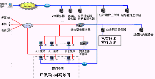 該12369環(huán)保熱線系統(tǒng)主要是由具有排隊功能的交換機(jī)或帶語音板卡的工控機(jī)、CTI服務(wù)器、IVR(交互式語音應(yīng)答)/IFR(交互式傳真應(yīng)答)子系統(tǒng)、人工座席子系統(tǒng)、應(yīng)用服務(wù)器、數(shù)據(jù)庫服務(wù)器、業(yè)務(wù)網(wǎng)關(guān)子系統(tǒng)、通信網(wǎng)關(guān)子系統(tǒng)等硬件設(shè)備和應(yīng)用軟件組成。