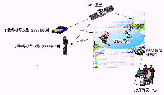 巡警利用移動(dòng)終端(帶手機(jī)通信功能的GPS接收機(jī))發(fā)出報(bào)警信號(hào),通過GSM系統(tǒng)送到指揮調(diào)度中心。