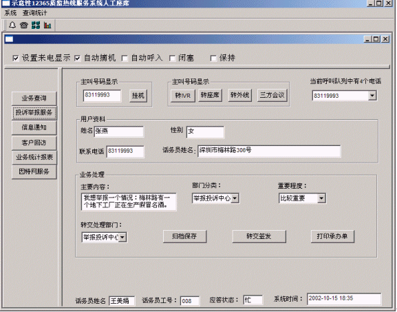 該系統(tǒng)利用質(zhì)量技術(shù)監(jiān)督局現(xiàn)有的信息網(wǎng)絡(luò)資源,將自動(dòng)語(yǔ)音查詢、人工服務(wù)、信息資料處理緊密結(jié)合起來(lái),為客戶提供全天候24小時(shí)不間斷的優(yōu)質(zhì)投訴服務(wù)。
