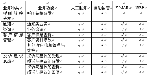 本系統(tǒng)具有自動語音服務(wù)、人工坐席服務(wù)、呼叫轉(zhuǎn)接分發(fā)、信息咨詢、信息查詢、客戶投訴建議、通知服務(wù)、因特網(wǎng)服務(wù)、管理人員對語音記錄的查詢、外包業(yè)務(wù)、增值服務(wù)等功能,并且結(jié)合圖形化的管理、監(jiān)控界面,使得客戶隨時隨地可以利用身邊的各種通訊工具獲得本公共呼叫中心平臺的方便快捷的服務(wù)。