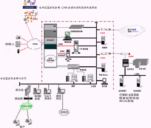 ·系統(tǒng)支持省-市-縣國家稅務(wù)局12366多媒體熱線系統(tǒng)的語音和數(shù)據(jù)聯(lián)網(wǎng); 提供完善的組網(wǎng)方案,實(shí)現(xiàn)資源共享,統(tǒng)一提供服務(wù)。