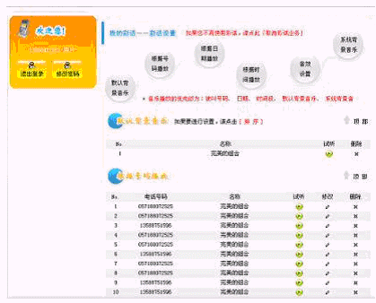 彩話業(yè)務(wù)系統(tǒng)BYBGM2.0功能強(qiáng)大,它允許將被叫分為不同的組或者將其設(shè)置為特殊號(hào)碼,這樣將可以設(shè)置他們的默認(rèn)背景音樂,還可以針對他們設(shè)置紀(jì)念日或者按照不同的時(shí)段設(shè)置不同的背景音樂。當(dāng)用戶喜歡幾首音樂但又不希望每次都聽相同的音樂時(shí),可以將一定數(shù)目的音樂設(shè)置為一個(gè)音樂盒(Music-Box),這樣系統(tǒng)會(huì)每次到音樂盒中隨機(jī)選取一首音樂作為彩話背景音樂。系統(tǒng)中提供的音樂素材不能滿足用戶的需求時(shí),用戶可以通過"彩話DIY"服務(wù)自己錄制音樂素材到系統(tǒng)中或?qū)⒅付ǜ袷降囊魳匪夭纳蟼鞯较到y(tǒng)中,充分展現(xiàn)自己的個(gè)性和創(chuàng)作才華。在通話過程中,用戶也可以隨心所欲控制彩話,這就是"隨心變奏"服務(wù),通過它用戶可以在通話過程中變換彩話背景音樂或音量的大小,這就使得用戶甚至可以編制一個(gè)通話場景(不同的背景音樂、不同的音效),并可以根據(jù)被叫的反應(yīng)及時(shí)加以控制,從而得以充分展現(xiàn)自己的通話魅力。