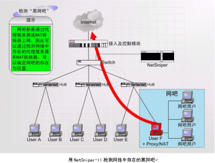 上圖中,NetSniper-II可以對網(wǎng)絡(luò)內(nèi)部各用戶進行檢測,一旦發(fā)生某個用戶安裝代理服務(wù)器軟件,其他用戶通過該用戶的接口上網(wǎng)偷逃網(wǎng)費的情況,或發(fā)現(xiàn)盜用MAC地址上網(wǎng)及通過Modem回?fù)苌暇W(wǎng)的情況,NetSniper-II即可定位這些用戶,并且采取通知系統(tǒng)管理員或自動封堵非法用戶等措施。