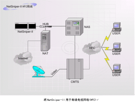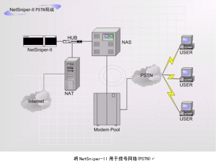 在這三個圖中,局端使用了NetSniper-II,如同在以太網(wǎng)絡(luò)的環(huán)境下一樣,NetSniper-II可以對網(wǎng)絡(luò)內(nèi)部各用戶進行檢測,一旦發(fā)生某個用戶安裝代理服務(wù)器軟件,其他用戶通過該用戶的接口上網(wǎng)偷逃網(wǎng)費的情況,或發(fā)現(xiàn)盜用MAC地址上網(wǎng)及通過Modem回?fù)苌暇W(wǎng)的情況,NetSniper-II即可定位這些用戶,并且采取通知系統(tǒng)管理員或自動封堵非法用戶等措施。