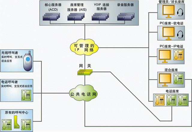 完全克服了傳統(tǒng)的客服中心對座席地理位置的約束,可以在多個地點設(shè)有座席和與電信公網(wǎng)的接入點,座席分布在多個地點獨立運營,但由一個中心點來控制和管理。
