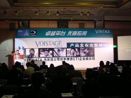 2004年2月19日,NTT DATA(中國)有限公司在北京長富宮飯店舉行了主題為"卓越平臺,無限應用"的VOISTAGE產(chǎn)品發(fā)布及應用研討會,在會上發(fā)布了CTI產(chǎn)品VOISTAGE。來自日本NTT DATA總公司的高層在會上發(fā)表主題演講時表示,NTT DATA將與戰(zhàn)略合作伙伴東進公司攜手共同大力推進VOISTAGE產(chǎn)品在中國中小企業(yè)級市場中的應用。