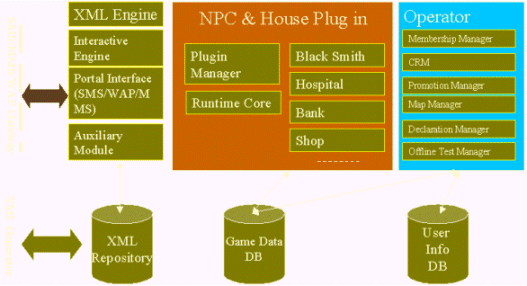 基于上述的因素,北京市萬隆然博科技有限責(zé)任公司率先在國內(nèi)推出了無線互連游戲平臺,把游戲的快速開發(fā)、游戲的運行引擎和游戲的客戶服務(wù)管理集成在一體。方便了短訊運營商的運營。同時,然博科技通過分析各類游戲的特點和無線交互方式的特點。具有獨創(chuàng)性的推出了一種游戲描述XML格式。通過然博科技提供的離線工具,游戲策劃人可以自己編寫腳本,自己定義場景,進行仿真。同時,上傳到實際運行的服務(wù)器端。真正的實現(xiàn)了短信門戶的個人創(chuàng)作工具。使得短信門戶真正的可以與傳統(tǒng)的Web門戶有相同的運營模式。ICP可以通過出賣短信服務(wù)器的硬盤空間來實現(xiàn)與內(nèi)容宿主共同盈利的模式。