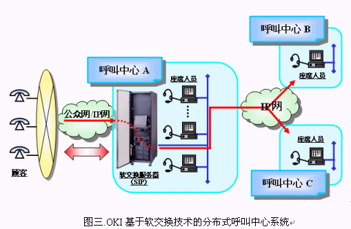 軟交換(Soft Switch)技術(shù)的出現(xiàn)實現(xiàn)了上述想法。目前,采用軟交換技術(shù)的呼叫中心已經(jīng)在中國市場展露頭角。其中,日本通信企業(yè)沖電氣(OKI)工業(yè)株式會社在中國推出的以軟交換為核心技術(shù)的新一代呼叫中心是較為典型的代表。