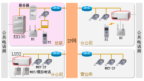 各事業(yè)所的系統(tǒng)利用IP網(wǎng),可以作為設(shè)置在總部等地的EX100的內(nèi)線使用。因此,不僅不需要在各事業(yè)所設(shè)置PBX/業(yè)務(wù)電話設(shè)備,而且在小型事業(yè)所也可以應(yīng)用業(yè)務(wù)電話設(shè)備無法提供的PBX服務(wù)功能。