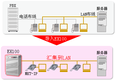 以往,辦公室內(nèi),各事業(yè)所間以分別構(gòu)筑語音,數(shù)據(jù)網(wǎng)絡(luò)為主流。而通過IP-PBX式 EX100裝置,可以在IP網(wǎng)上統(tǒng)一這些語音和數(shù)據(jù),簡化系統(tǒng)構(gòu)成。因此,可以大幅度削減各事業(yè)所間通信的運行成本(Running cost)。