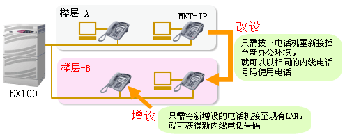 而且,在增設(shè)電話機時只需將電話機接到LAN集線器上就完成了電話設(shè)置,大幅度削減了以往繁瑣的設(shè)置過程及成本。