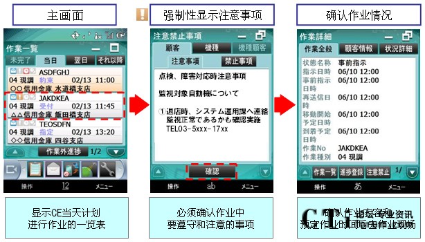 “MoBiz AP for CE支持系統(tǒng)”是在支持保修人員在工作現(xiàn)場(chǎng)作業(yè)的同時(shí),實(shí)現(xiàn)總部對(duì)工作現(xiàn)場(chǎng)“可視化”管理的應(yīng)用程序軟件包。
