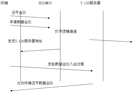 采用帶外方式,數(shù)據(jù)與音頻視頻流分開(kāi),各自占用帶寬。與終端和MCU無(wú)任何關(guān)系。如果用戶想召開(kāi)數(shù)據(jù)會(huì)議,需要單獨(dú)的一臺(tái)PC機(jī)來(lái)進(jìn)行數(shù)據(jù)的接受與傳送,所有需要數(shù)據(jù)會(huì)議功能的用戶的PC機(jī)都連接到一個(gè)T.120服務(wù)器上。目前常用的終端軟件是Netmeeting軟件。數(shù)據(jù)占用單獨(dú)的帶寬,不擠占音視頻的帶寬。會(huì)議建立過(guò)程為: