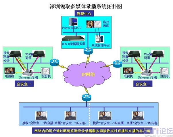 錄播服務(wù)器放置在管理中心,視音頻編碼器(采集聲音、圖像)放置在會(huì)議室,VGA編碼器(采集VGA信號(hào))放置在會(huì)議室,客戶(hù)端分別為網(wǎng)絡(luò)內(nèi)的任意一臺(tái)計(jì)算機(jī)。整個(gè)系統(tǒng)簡(jiǎn)單明了,分布靈活,無(wú)需專(zhuān)業(yè)布線(xiàn)即可完成安裝。各部分功能如下: