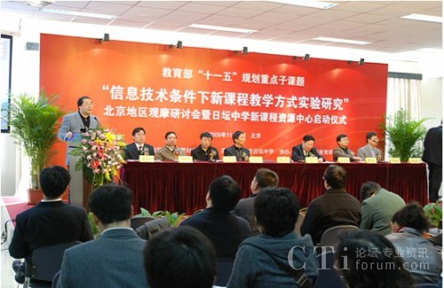 CTI論壇(ctiforum)11月11日消息(記者 潘婷):2009年11月5日, 教育部基礎(chǔ)教育課程教材發(fā)展中心在北京日壇中學(xué)隆重舉辦了“信息技術(shù)條件下新課程教學(xué)方式實(shí)驗(yàn)研究”北京地區(qū)觀摩研討會暨日壇中學(xué)課程資源中心啟動儀式。到會的有教育部及北京市教委相關(guān)領(lǐng)導(dǎo)及北京市內(nèi)及外省市學(xué)校的的領(lǐng)導(dǎo)及老師600多人。