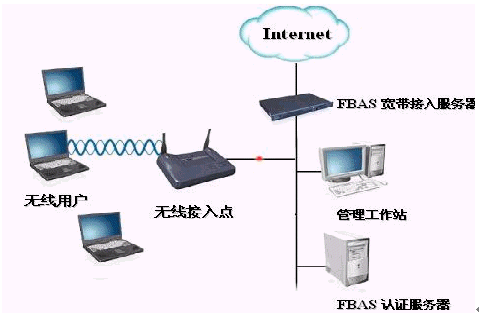 移動(dòng)用戶通過自身的無線網(wǎng)卡傳遞信息到熱點(diǎn)接收器上,熱點(diǎn)接收器連接到交換機(jī)(是為了能具有更好的可拓展性),交換機(jī)連接到華夏科技FutureWorks寬帶計(jì)費(fèi)系統(tǒng)的FBAS接入服務(wù)器上,通過接入服務(wù)器連接到INTERNET.這里的FBAS3000系列的寬帶接入服務(wù)器采用的是一體機(jī)的模式,接入,認(rèn)證,計(jì)費(fèi)等一系列服務(wù)均安裝在FBAS里,這樣可以簡化網(wǎng)絡(luò)結(jié)構(gòu)。對(duì)FBAS的操作是通過WEB頁面來進(jìn)行設(shè)置維護(hù)的,
