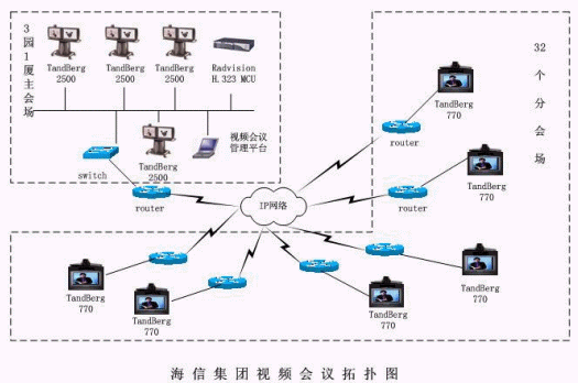 山東海信集團有限公司會議電視項目以海信大廈為中心,覆蓋各個省的35個分支機構。充分利用自己網(wǎng)絡資源的優(yōu)勢,采用ITU(國際電聯(lián))的H。323標準。于-2004-年初經(jīng)過系統(tǒng)方案的征集、產(chǎn)品的反復測試,最終確定了由華夏科技代理的挪威TANDBERG的視頻終端,并于2004年6月份簽訂了一期采購合同,共計36套視頻終端。
