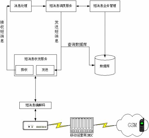 短信息控制模塊的功能負責控制短消息的發(fā)送過程,包括調(diào)度服務和重發(fā)體制。因為短消息設備是串行設備,同一時刻只能發(fā)送一條短消息,當用戶有群發(fā)請求時,通過調(diào)度服務完成一次發(fā)送多條消息的任務。在短信息發(fā)送過程中如果發(fā)現(xiàn)短消息發(fā)送失敗,則由該模塊重新組織嘗試發(fā)送。嘗試的時間和次數(shù)可以由業(yè)務管理模塊設置。