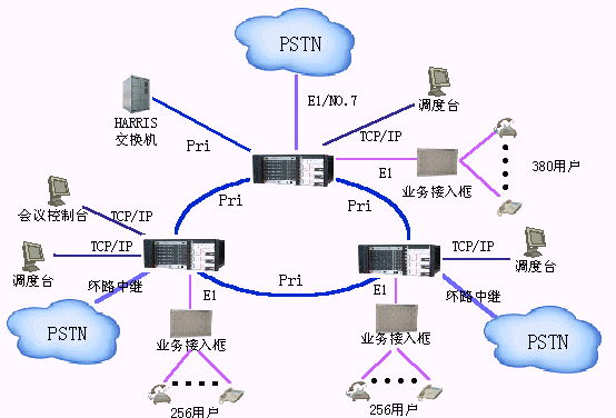 該方案適用于用戶需要建立自己的通信網(wǎng)并能實(shí)現(xiàn)行政交換、電話會議、調(diào)度交換、語音信箱等多種功能。這種方案解決的業(yè)務(wù)種類多,能滿足用戶的多種需要。