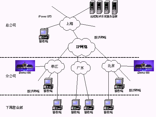 某證券公司有三級(jí)網(wǎng)絡(luò),總公司、分公司和下屬營(yíng)業(yè)部?偣镜椒止編捠2M,在總公司配置一套會(huì)議室型電視會(huì)議終端POLYCOM 970和一套多點(diǎn)會(huì)議服務(wù)器Radvision ViaIP400。在分公司配置了38套會(huì)議室型電視會(huì)議終端POLYCOM 680,用于與總公司進(jìn)行雙向視頻會(huì)議。分公司到營(yíng)業(yè)部帶寬是512K,各營(yíng)業(yè)部安裝遠(yuǎn)程股評(píng)系統(tǒng)接收端程序,遠(yuǎn)程股評(píng)系統(tǒng)服務(wù)器都放置在海通總公司。當(dāng)在總公司進(jìn)行股評(píng)時(shí),總公司本地?cái)z像頭拍攝教師畫面,MIC采集教師聲音,傳給服務(wù)器編碼,再通過(guò)網(wǎng)絡(luò)供各個(gè)接收端接收;當(dāng)在分公司進(jìn)行股評(píng)時(shí),首先分公司的電視會(huì)議設(shè)備采集教師畫面及聲音傳回總公司的電視會(huì)議設(shè)備,再傳給遠(yuǎn)程股評(píng)系統(tǒng)的服務(wù)器進(jìn)行編碼,然后通過(guò)網(wǎng)絡(luò)發(fā)布,供接收端接收。(結(jié)構(gòu)如下圖)