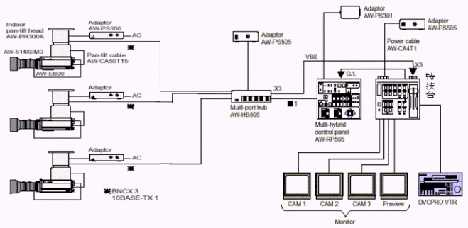 移動(dòng)攝象機(jī)采用的松下E300攝像機(jī)是一款廣播級(jí)攝像機(jī),水平分辨率:800線,最小照度:1.5lux信噪比:60dB。我公司在國(guó)家郵政總局直播室成功應(yīng)用過此款攝像機(jī),效果非常好。系統(tǒng)連接圖如下