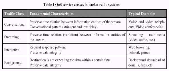 3G無線傳輸堆棧通常由二種不同類型的輸送介質(zhì)組成,專用和共享信道。然而,使用專用信道用戶可以獲得固定帶寬用于傳輸數(shù)據(jù),但使用共享信道用戶只有在動態(tài)的帶寬下傳輸數(shù)據(jù),類似于ATM或GSM GPRS。HSDPA將會成為共享信道在空中的一個擴(kuò)展。除了MMS,在3G系統(tǒng)的初始階段所有的流媒體和會話應(yīng)用都希望使用專用信道。 在現(xiàn)代的系統(tǒng)設(shè)計中,一個應(yīng)用可以請求許多不同的服務(wù)質(zhì)量(QoS)級別的其中之一。服務(wù)質(zhì)量級別包含最大誤碼率、最大延遲和最大保證的帶寬等參數(shù)。此外,通常根據(jù)不同的應(yīng)用分為不同的服務(wù)級別:會話應(yīng)用、流媒體應(yīng)用、交互應(yīng)用以及后臺通信應(yīng)用。特性和典型的例子見表1。