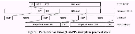 因為包交換服務(wù),3GPP/3GPP2同意了一個基于IP的協(xié)議棧。圖3展示了一個NAL單元通過3GPP2用戶平面協(xié)議堆棧被封裝在RTP/UDP/IP的典型過程。在頭壓縮(RoHC)后,此IP/UDP/RTP包被封裝進(jìn)一個PDCP/PPP2包,變成了頻率鏈路控制(RLC)和服務(wù)數(shù)據(jù)單元(SDU)。RLC協(xié)議可以在三種模式下工作:透明、非確認(rèn)和確認(rèn)模式。RLC協(xié)議為用戶和數(shù)據(jù)提供分段和重傳服務(wù)。在透明和非確認(rèn)模式,RLC被定義為單向的;在確認(rèn)模式,RLC被定義為雙向的。對於所有的RLC模式,循環(huán)冗余檢查(CRC)的錯誤檢測在物理層上被運(yùn)行,而且CRC檢查的結(jié)果和真實(shí)的數(shù)據(jù)一起被遞送到 RLC。在透明模式中,沒有上層的協(xié)議被增加到較高層的數(shù)據(jù)中。錯誤的協(xié)議數(shù)據(jù)單元(PDUs)可以被丟棄或標(biāo)記為錯誤。在非確認(rèn)模式中,沒有重傳協(xié)議在使用中,而且數(shù)據(jù)傳送沒有保證。接受到的錯誤數(shù)據(jù)根據(jù)配置來決定丟棄或標(biāo)記為錯誤。在確認(rèn)模式中,一種自動的重復(fù)請求機(jī)制被用于錯誤訂正。
