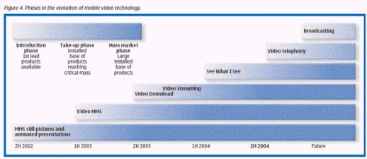 從諾基亞到其它公司,目前有許多具有視頻功能的手機(jī)紛紛出現(xiàn)在市面上。例如,60系列平臺包括了流媒體和視頻播放器功能。獲得60系列平臺許可證的公司有:諾基亞、松下、三星、Sendo和西門子,大致占有全球移動終端市場份額的60%。目前市場上基于60系列的手機(jī)有:西門子的SX-1,三星的SGH-700,諾基亞的7650/3650以及諾基亞的N-Gage。這些手機(jī)立即為發(fā)展商和運(yùn)營商帶來了市場機(jī)遇,同時(shí)也為未來的60系列手機(jī)建立起一個(gè)統(tǒng)一的、可運(yùn)作的商業(yè)應(yīng)用市場。