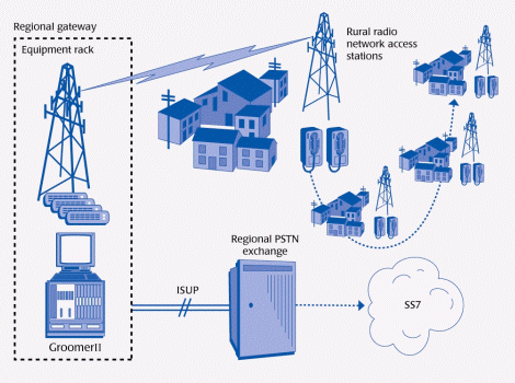 這里,每一本地-鄉(xiāng)村網(wǎng)絡(luò)里的"電話對(duì)"是通過(guò)Aculab公司的GroomerII與國(guó)內(nèi)電話網(wǎng)集成起來(lái)的。作為網(wǎng)絡(luò)的一個(gè)戰(zhàn)略要點(diǎn),GroomerII提供的E1鏈路可根據(jù)連接到的本地交換機(jī)的需要,運(yùn)行多種不同的協(xié)議,包括Q.931和ITU-T ISUP。因此,GroomerII作為鄉(xiāng)村電話網(wǎng)和國(guó)內(nèi)轉(zhuǎn)接局之間的網(wǎng)關(guān),提供Q.931/ITU-T ISUP到E1 CAS協(xié)議的轉(zhuǎn)換。