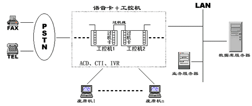 在一些小型CALL CENTER系統(tǒng)中,人們通常通過語音板卡加工控機的方式搭建系統(tǒng),通常一臺設備就集成了ACD、IVR、CTI等各種資源,各資源的使用、調(diào)派通過軟件進行控制,有效的解決了建設成本高、系統(tǒng)構造繁復的問題,具有相當?shù)撵`活性。然而由于工控機和語音板卡容量有限,同時其標準最多只能是工業(yè)級標準,因此在構建相對大型的呼叫中心時就總是捉襟見肘。為了增加系統(tǒng)容量,解決多臺PC之間進行通道交換的難題,人們又設計了過機卡和過機線來解決,其應用系統(tǒng)如下圖: