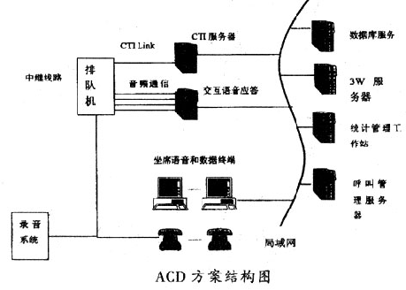 這種方案的核心思想是在專用交換機(jī)+ACD的基礎(chǔ)上擴(kuò)展路由和統(tǒng)計(jì)的功能,開放CTI -Link接口,用CTI技術(shù)實(shí)現(xiàn)通信和計(jì)算機(jī)的功能結(jié)合,再配以必要的語音和數(shù)據(jù)庫系統(tǒng),從而以強(qiáng)大的通信和計(jì)算機(jī)功能滿足呼叫中心的要求。