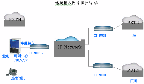 遠端接入:根據實際遠端中繼數量,選擇IP MUX4/8/16網關,通過環(huán)路中繼接口連接本地的電信網;