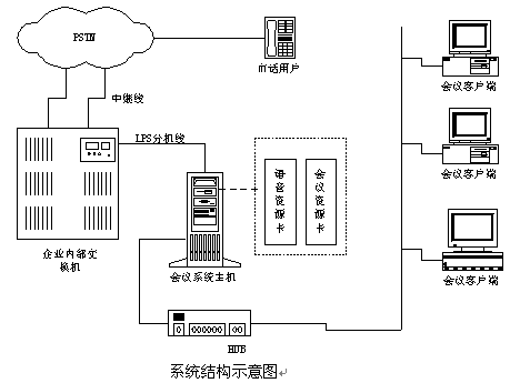 說(shuō)明:如果沒(méi)有企業(yè)內(nèi)部程控交換機(jī)則可以將中繼線直接接在會(huì)議系統(tǒng)主機(jī)上,中繼線可以是普通模擬中繼,也可以是E1接口(如中國(guó)一號(hào)信令、30B+D等)。在與會(huì)議系統(tǒng)主機(jī)的同一網(wǎng)段上可以配置多個(gè)會(huì)議客戶(hù)端系統(tǒng),通過(guò)客戶(hù)端系統(tǒng)用戶(hù)可以隨時(shí)觀察和監(jiān)視會(huì)議系統(tǒng)的使用情況,并且可以建立常用用戶(hù)的用戶(hù)資料,也可以對(duì)常用用戶(hù)進(jìn)行分組,這樣要呼叫某些用戶(hù)開(kāi)會(huì)時(shí)只需呼叫組用戶(hù)即可;