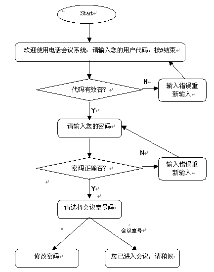 說(shuō)明:用戶(hù)代碼、密碼等電話會(huì)議資料管理員可以通過(guò)客戶(hù)端管理系統(tǒng)來(lái)建立。該語(yǔ)音流程也可以通過(guò)Smatele語(yǔ)音流程生成器來(lái)改寫(xiě),方法為在Server端執(zhí)行程序的當(dāng)前路徑下編寫(xiě)一個(gè)名為User.dat的語(yǔ)音流程腳本文件即可,具體方法可以參閱《SmarTele流程生成器說(shuō)明》和user_con.dat說(shuō)明;