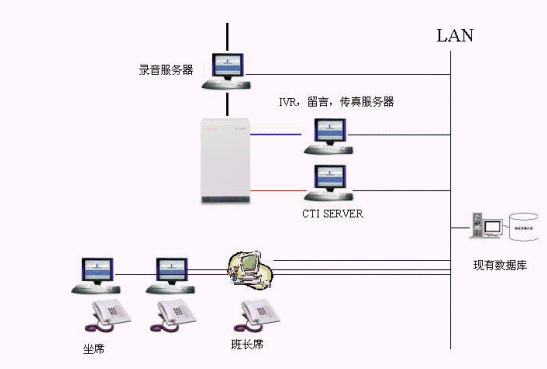 按照用友北京分公司行業(yè)特點(diǎn)、現(xiàn)狀和需求,呼叫中心系統(tǒng)采用愛立信MD110交換機(jī),加配CTI接口設(shè)備,配合我公司的CTILink和IVR服務(wù)器,實(shí)現(xiàn)呼叫中心的全部功能。該系統(tǒng)中繼線采用數(shù)字中繼線(30B+D),16路IVR系統(tǒng)和20個(gè)人工坐席,處理用戶申告業(yè)務(wù)。