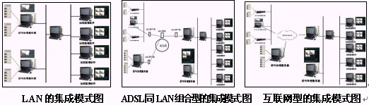 本公司的數(shù)字式視頻監(jiān)控系統(tǒng)各個(gè)組成要素之間的物理連接沒有做任何限制及規(guī)定,只要支持國際性的通信標(biāo)準(zhǔn)協(xié)議HTTP,就可以集成出一個(gè)面向于某種具體需求的系統(tǒng)。下面列舉了本系統(tǒng)3種典型應(yīng)用的拓?fù)淠J綀D。