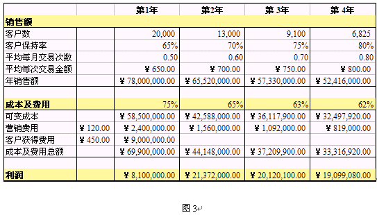 如圖3所示,將各年的銷售額分別減去成本及費(fèi)用,就得到各年度的利潤額。我們發(fā)現(xiàn)這一組客戶貢獻(xiàn)的利潤,從第1年的¥8,100,000.00到第2年的¥21,372,000.00,有顯著上升;利潤在第2年達(dá)到頂點(diǎn)后,逐年緩慢下降,下降的幅度比較小。