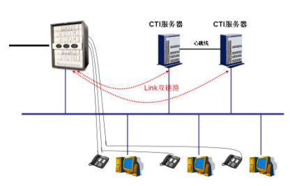 采用Hi-Link鏈路級雙機備份機制可有效地防止呼叫中心系統(tǒng)單點故障的發(fā)生。呼叫中心兩臺互為熱備的CTI系統(tǒng)通過獨立的CTI Link鏈路連接到交換機,使得該雙機熱備方案真正成為無單點故障的熱備方案。系統(tǒng)框圖如下: