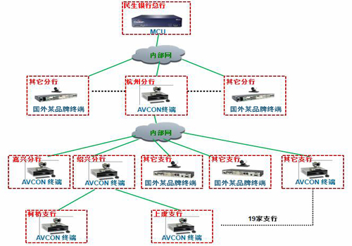 華平視頻會(huì)議系統(tǒng)應(yīng)用于民生銀行杭州分行以及下屬兩家三級(jí)分行和19家支行。其中杭州分行高清主會(huì)場(chǎng)采用AVCON CS2800全高清終端,融合高清視頻編解碼、寬頻語音等技術(shù),提供1080P全高清畫質(zhì)的交互體驗(yàn),實(shí)現(xiàn)與分行華平視頻終端以及其他品牌視頻終端的接入,從而實(shí)現(xiàn)總行、分行、支行的三級(jí)視頻會(huì)議。
