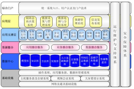 整個(gè)系統(tǒng)的底層是信息系統(tǒng)的基礎(chǔ)設(shè)施,這包括網(wǎng)絡(luò)及通訊設(shè)施、主機(jī)服務(wù)器及存儲(chǔ)系統(tǒng)、視頻會(huì)議系統(tǒng)、大屏幕數(shù)據(jù)演示系統(tǒng),以及操作系統(tǒng)、數(shù)據(jù)庫管理系統(tǒng)及網(wǎng)絡(luò)通訊基礎(chǔ)設(shè)施等,這些是系統(tǒng)最基本的運(yùn)行基礎(chǔ)。